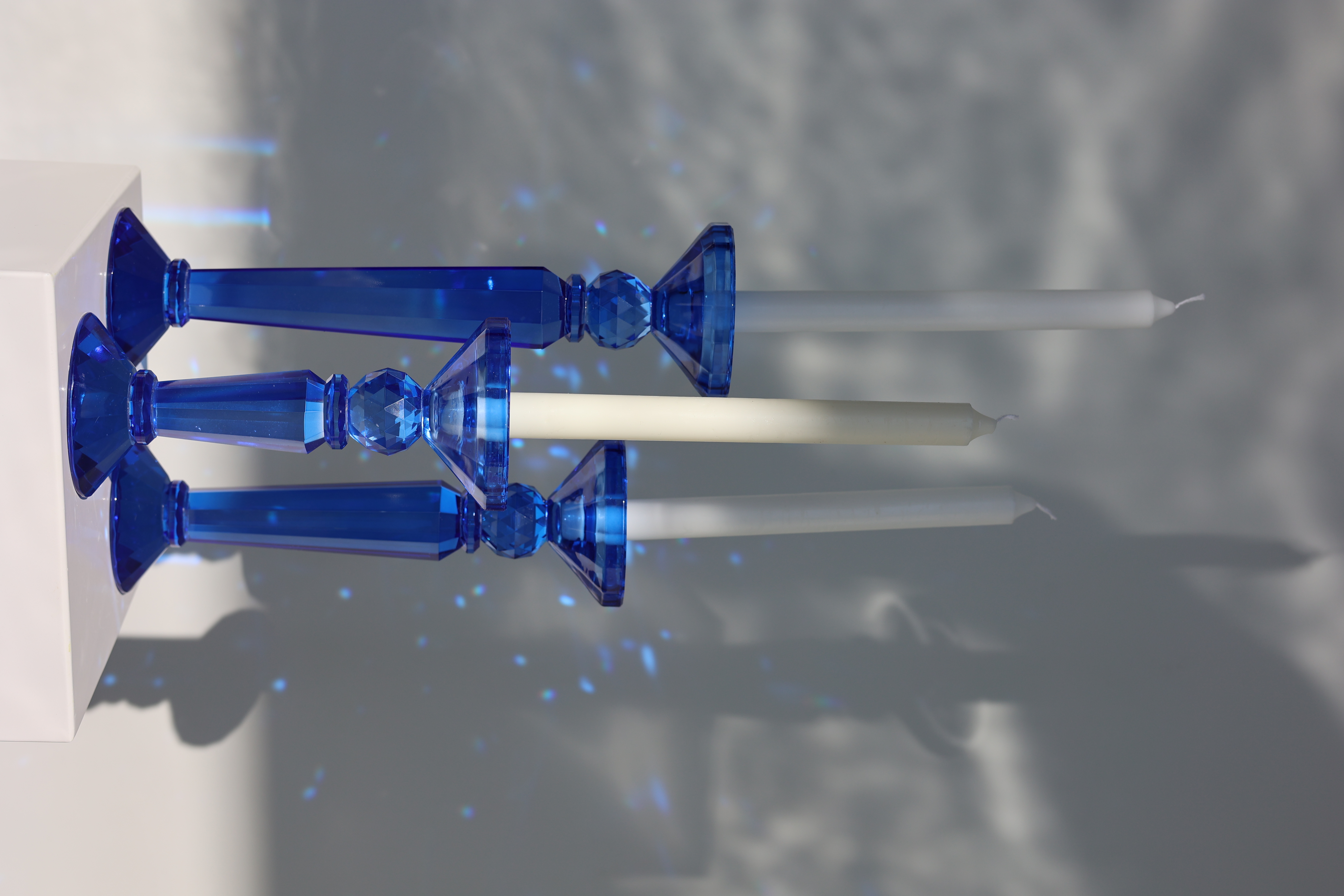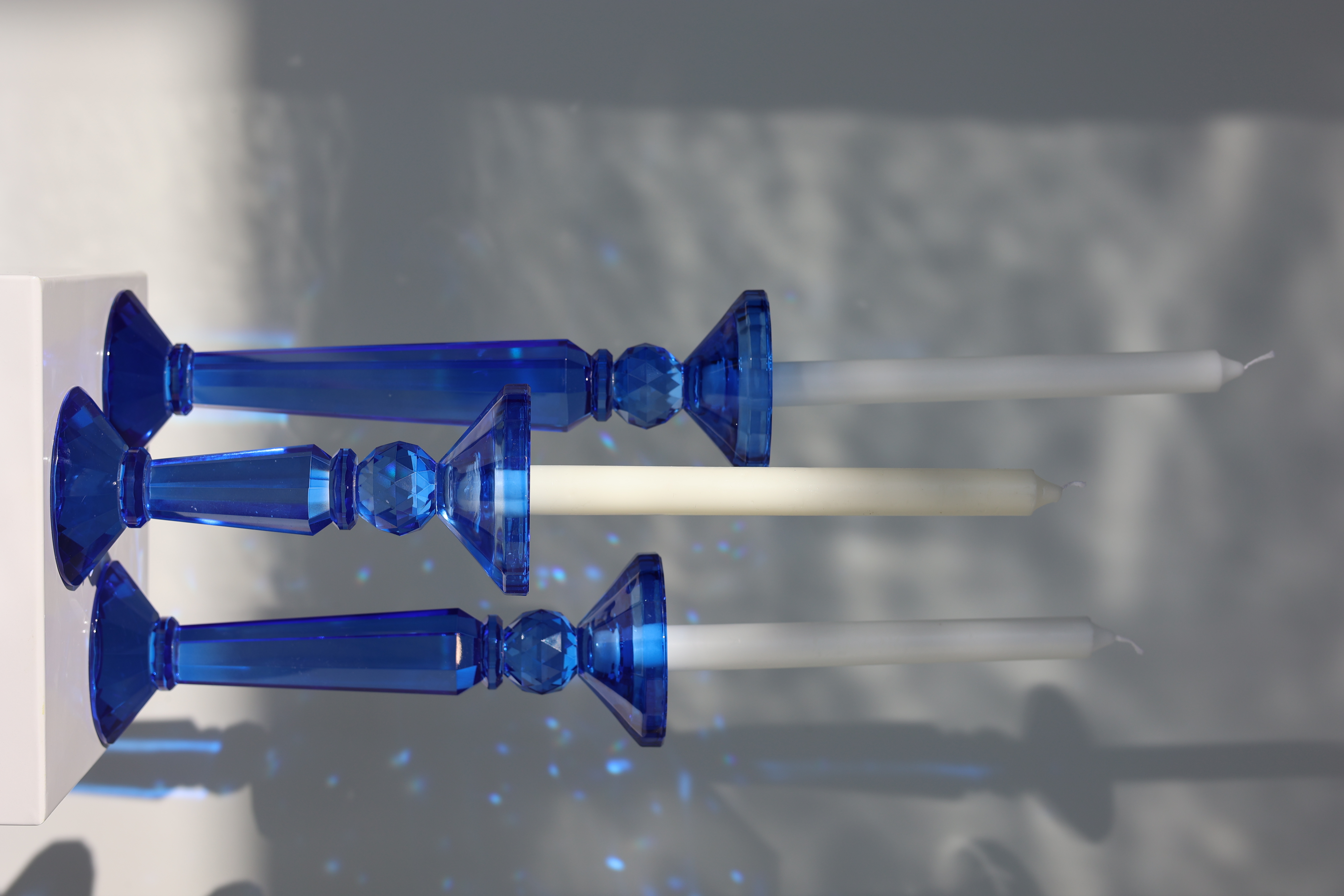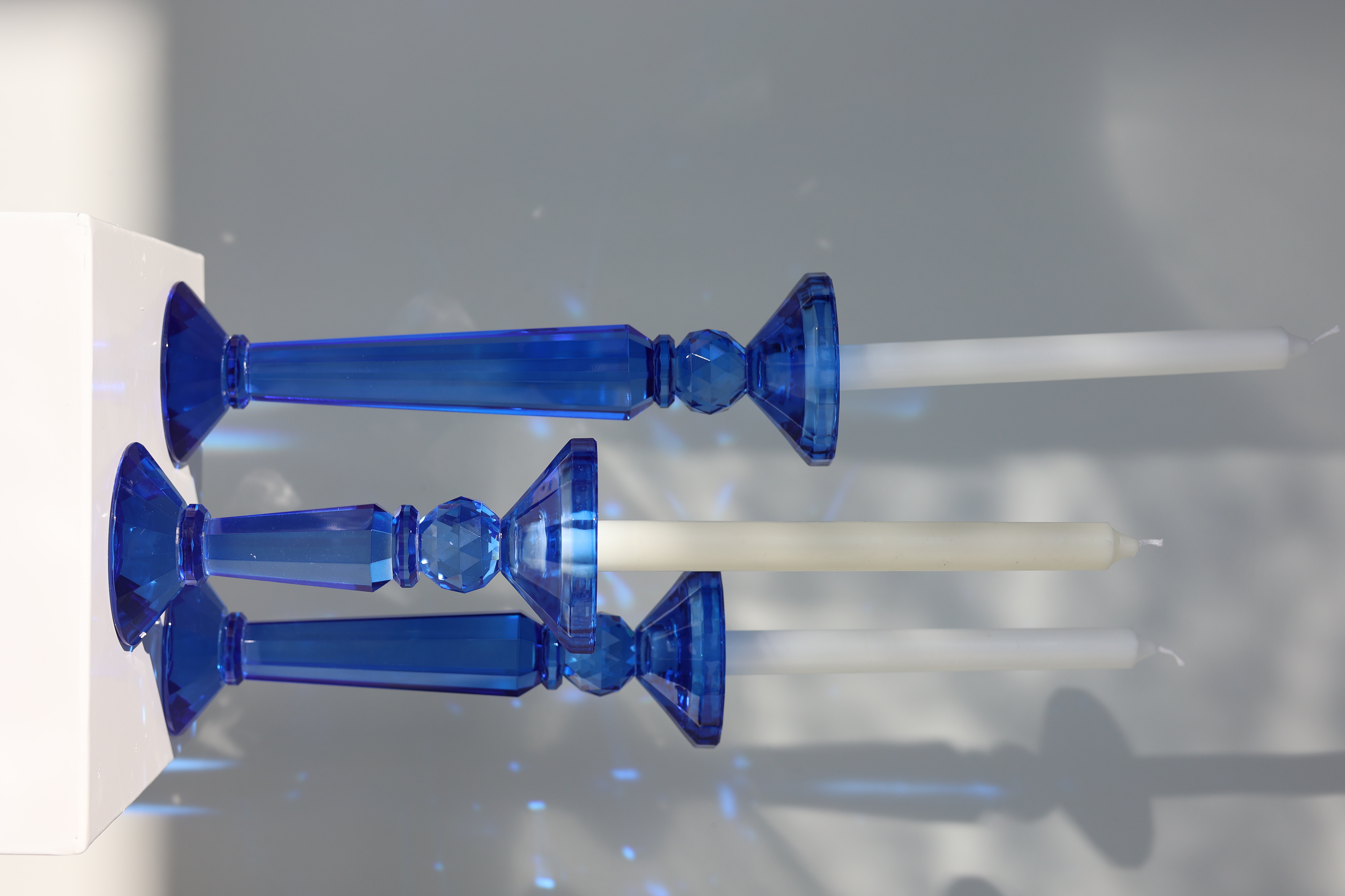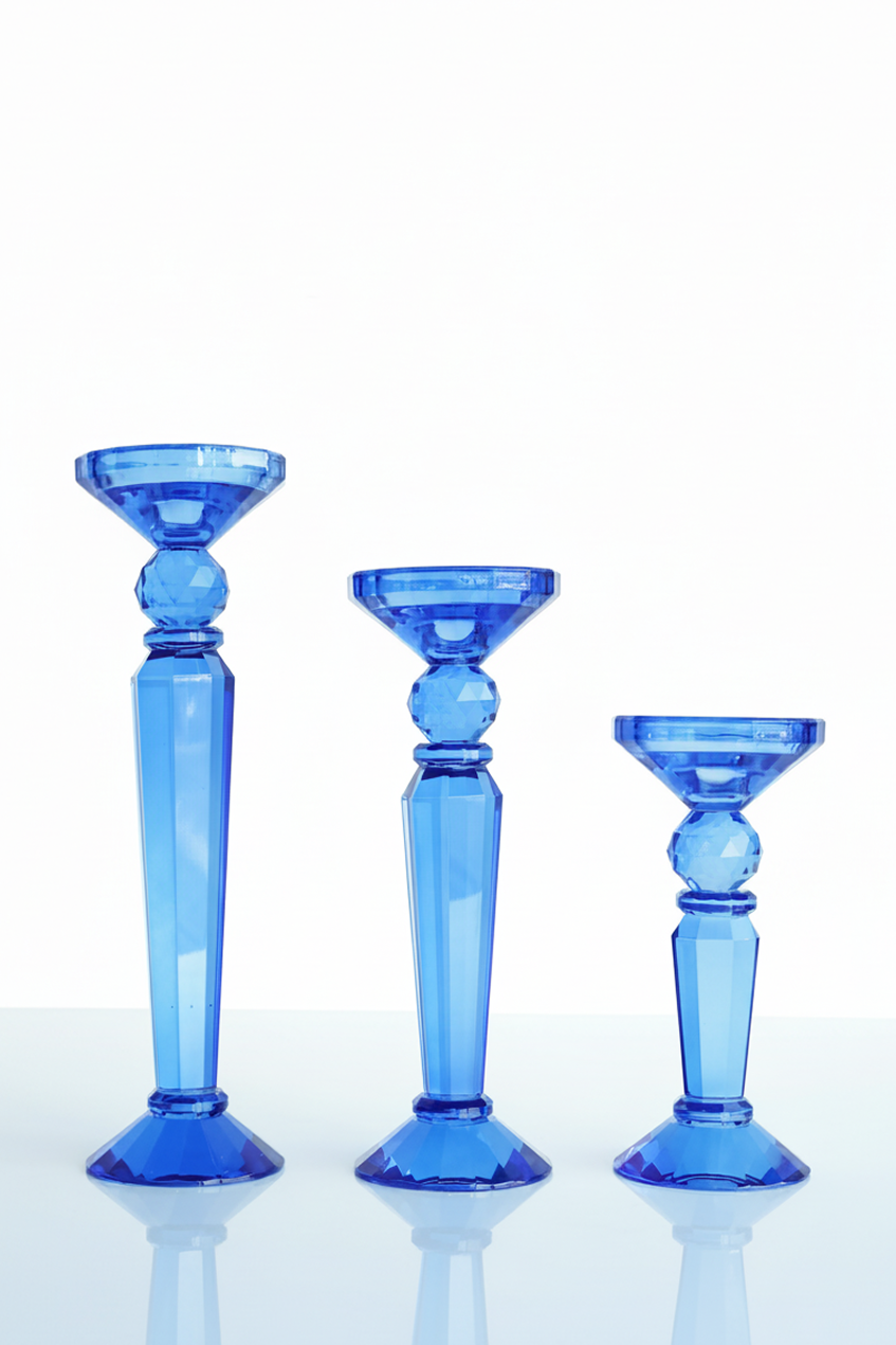 Product ID: CH-Sapphire-69LLike a splash of liquid starlight, this crystal sapphire blue candle holder transforms ordinary candlelight into something magical. Available in three sizes, it's perfect for creating eye-catching arrangements that catch and scatter light across your space. The crystal's deep sapphire blue hue adds a touch of mystery and sophistication, while its pristine clarity lets the warm glow of candlelight dance through unimpeded. Mix and match from four stunning color options to create your own constellation of light, or cluster different sizes together for a dramatic centerpiece that commands attention. Whether perched on a mantel, gracing a dining table, or adding ambiance to your favorite reading nook, this crystal sapphire blue holder turns any candle into an enchanting display of light and shadow.